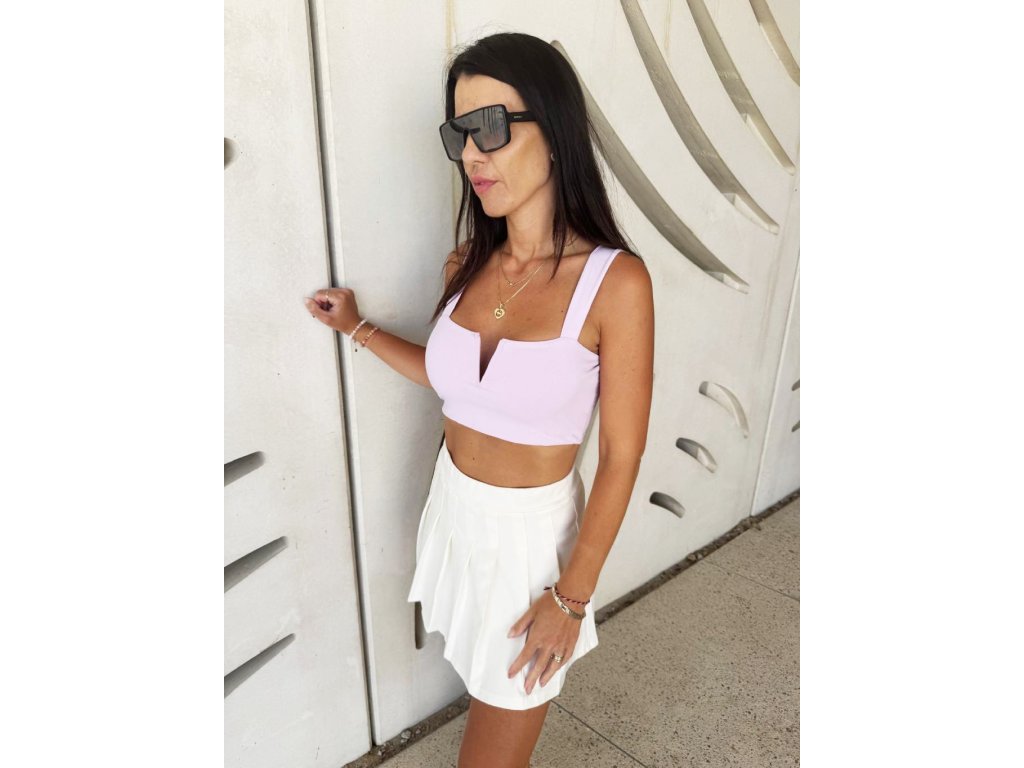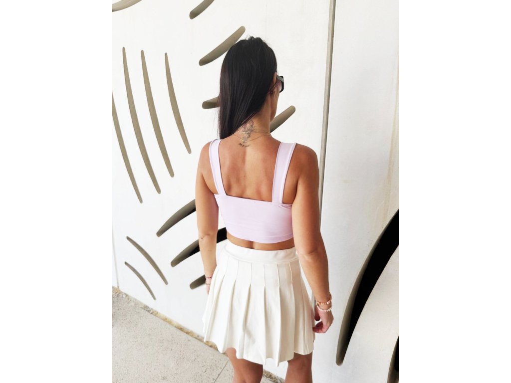 Zkrácený růžový top na ramínka – svěží, lehký a perfektní na léto. Pružný materiál.