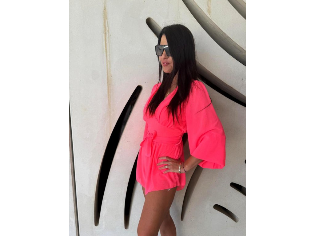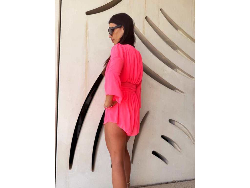 Lososový letní overal, který zaujme výraznou barvou a pohodlným střihem. Perfektní na dovolenou, k moři i na neformální letní večery.
