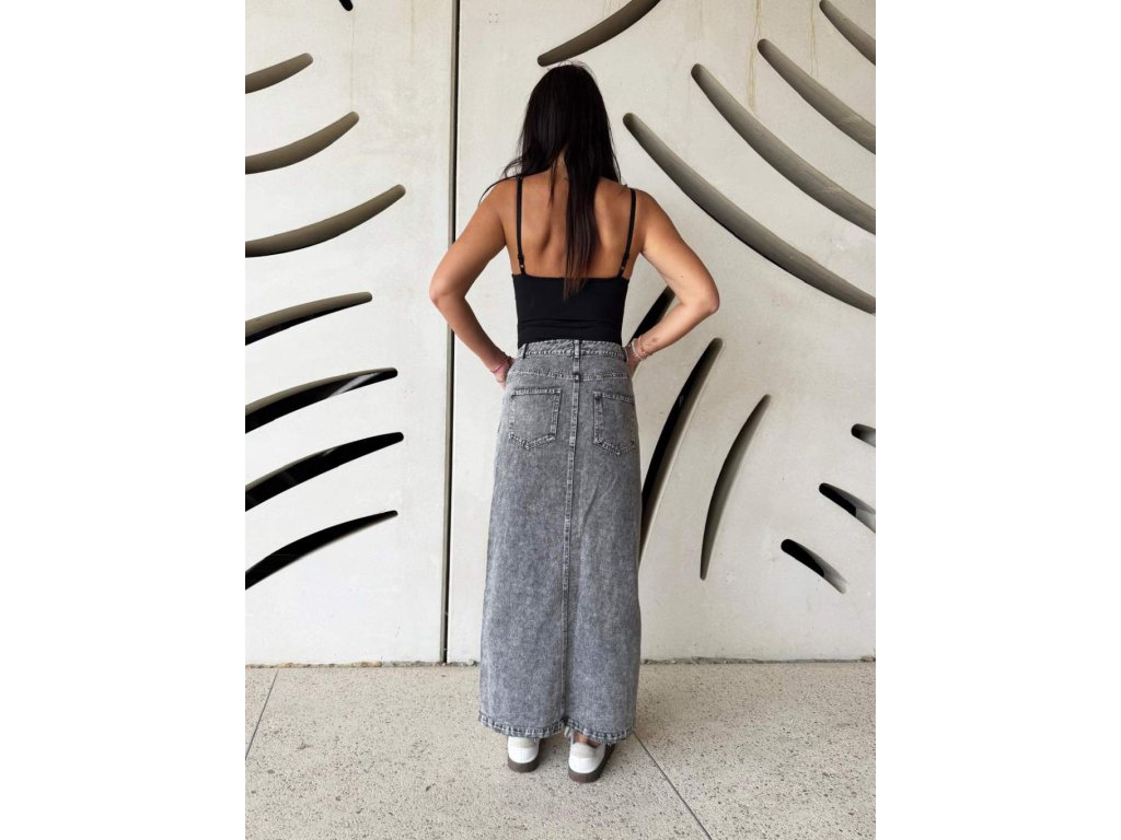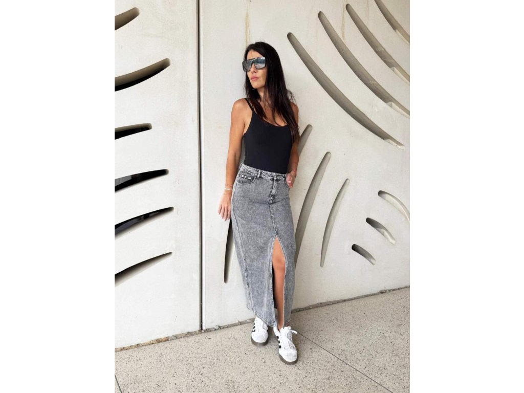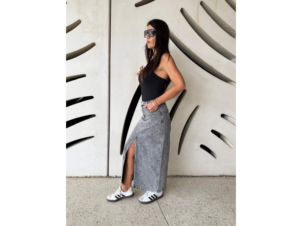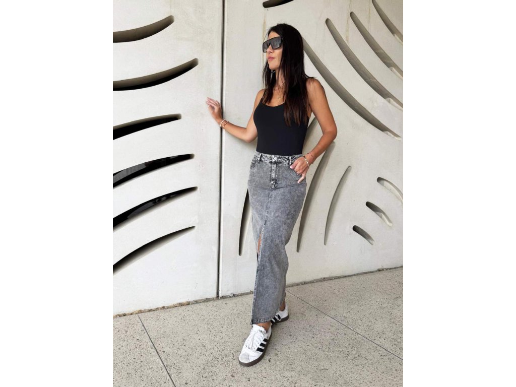 Tahle šedá džínová sukně s čistým střihem a rozparkem vpředu je základní kousek, který využiješ napříč ročními obdobími.